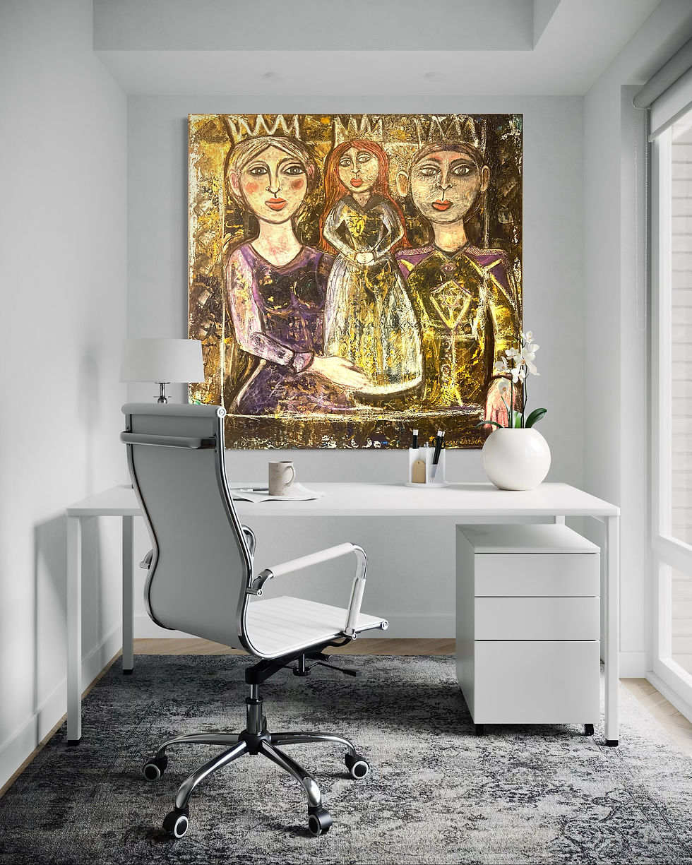 Each panel features a vintage portrait emerging through layers of rich texture, as if breaking through time itself. The torn-paper effect, combined with vibrant floral hues, golden undertones, and expressive pastel strokes, evokes both revelation and erosion suggesting themes of renewal and impermanence. The crowned figures symbolize power and reinvention, while the gestural handwriting adds a personal, almost whispered narrative to the piece.
