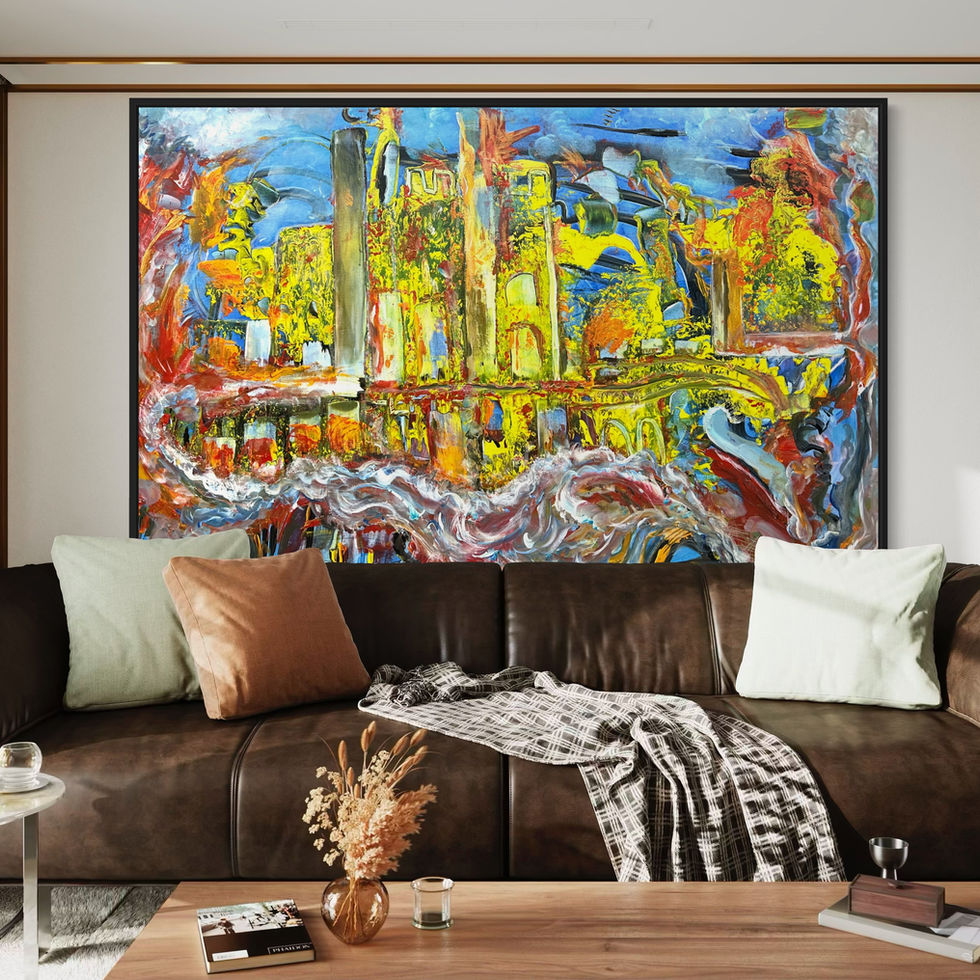 Brooklyn on Fire is a breathtaking 36 x 48-inch acrylic painting on canvas, framed and ready to elevate any space with its vibrant energy and evocative narrative. This large-scale masterpiece captures the essence of Brooklyn in a dynamic, abstract style, with a striking interplay of color and texture that evokes the citys fiery spirit and resilience.