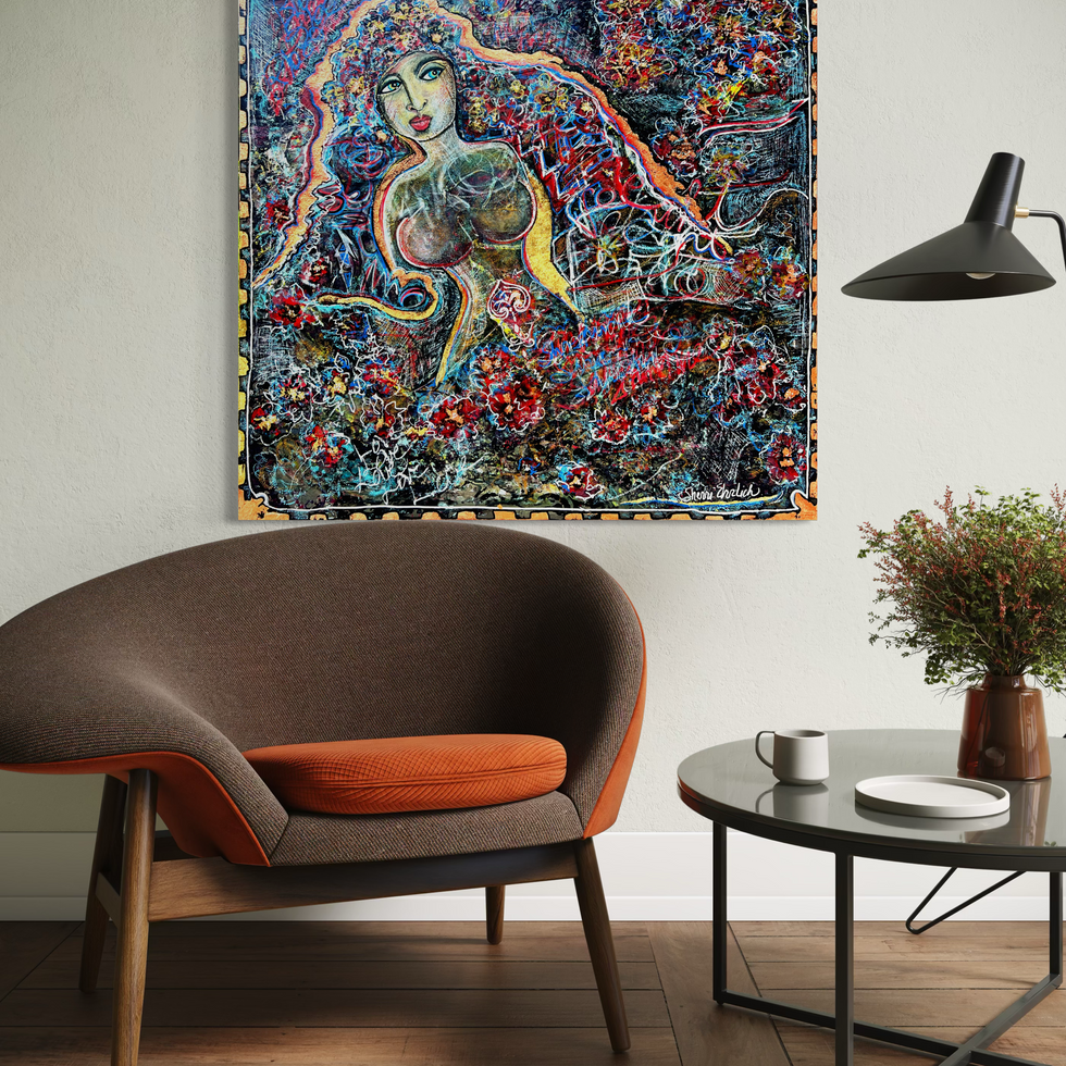 Signed by the artist in the lower right corner, Golden Goddess is a statement piece, ready to ignite any space with its bold beauty and spiritual charge.
