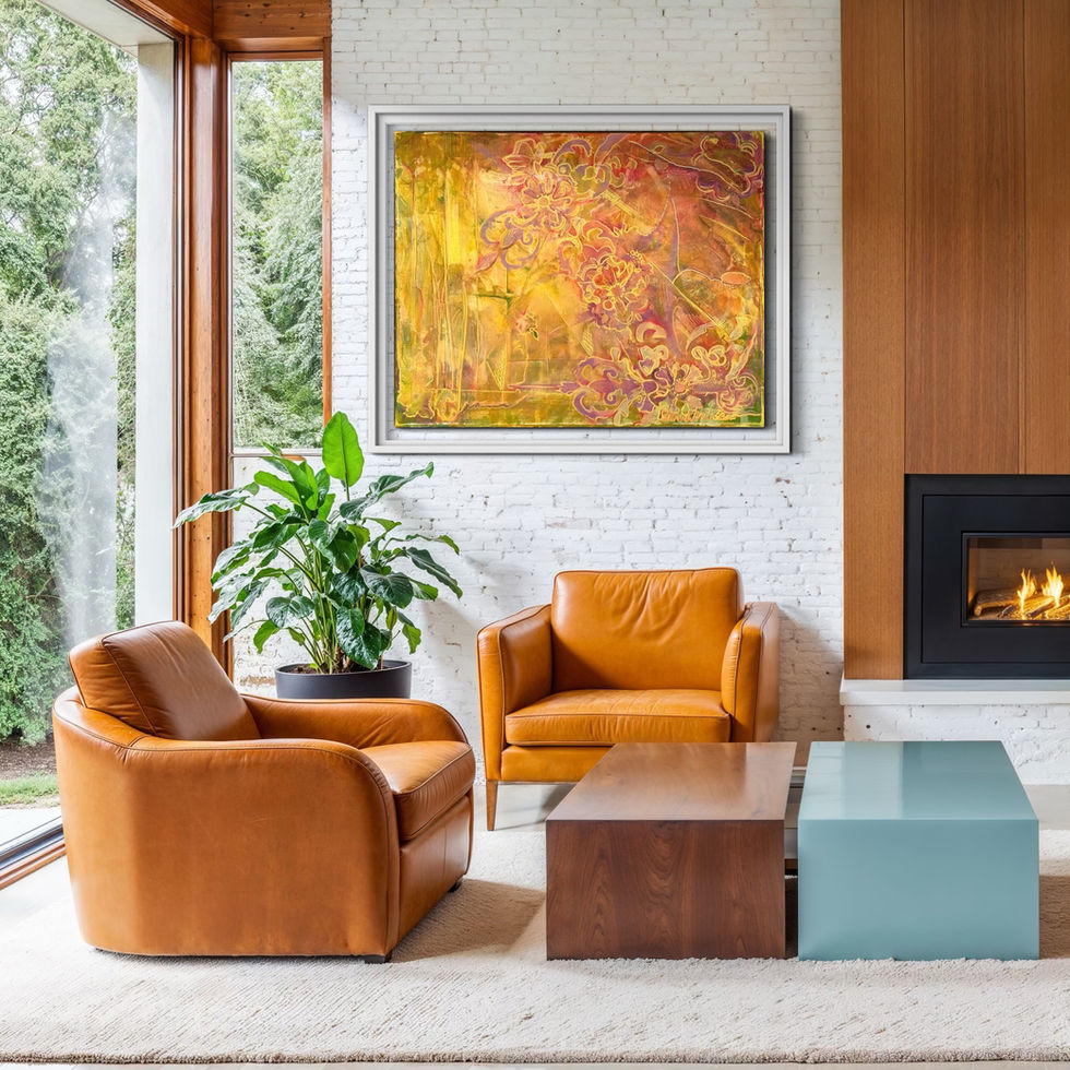 Hot Days by Sherri Ehrlich is an evocative abstract expressionist painting that captures the essence of warmth and vitality through its rich golden-yellow and amber hues. Floral motifs emerge from the textured surface, blending seamlessly with organic patterns and delicate line work that suggest movement and life. The composition is both vibrant and harmonious, with soft pastel accents that contrast against the glowing, sunlit backdrop. The dynamic floral patterns give the impression of blooming under the intense heat of summer, evoking feelings of passion and energy.