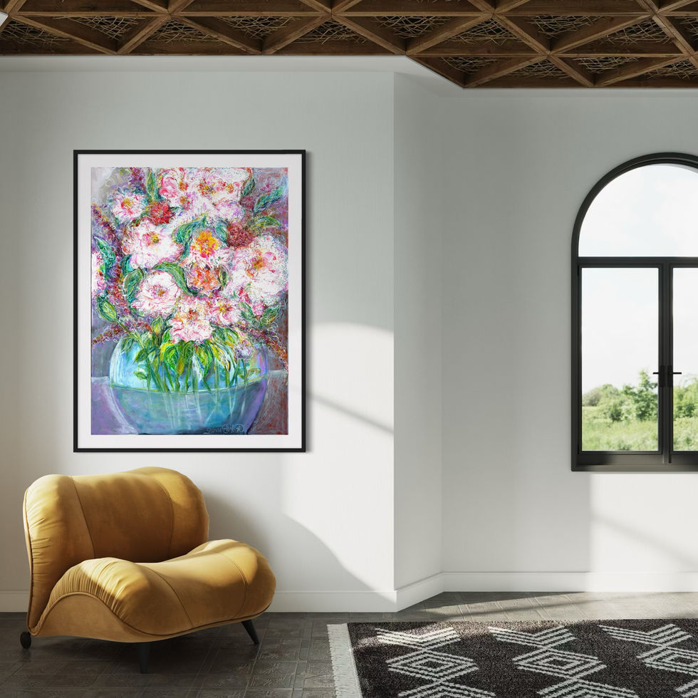 A radiant explosion of florals blooms within a luminous glass bowl, Vessel of Bliss celebrates the delicate harmony between nature and light. This lush, large-scale mixed media painting invites the viewer into a dreamlike garden where creamy blossoms swirl with energetic texture, kissed by vibrant strokes of magenta, lemon, coral, and green. Thick, expressive brushwork and layered techniques bring the petals and leaves to life, while the transparent vase reflects the ambient joy of the composition.